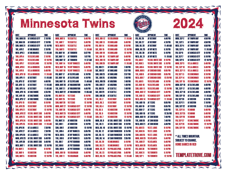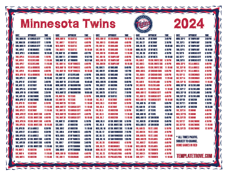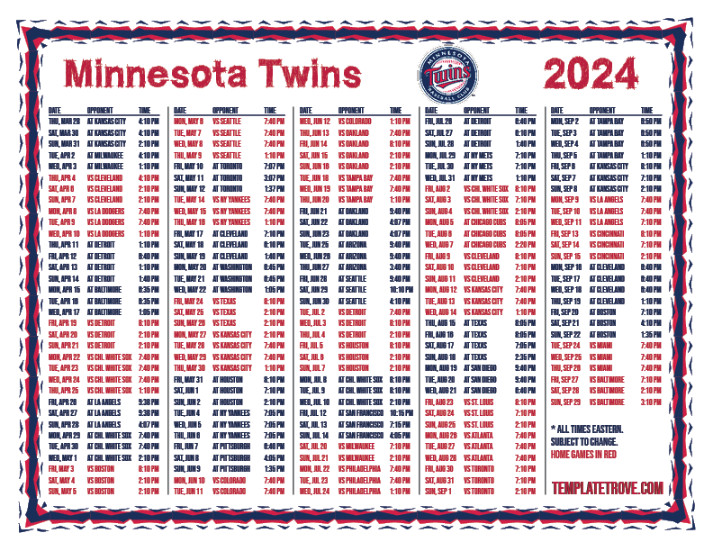 Keep up with the 2024 Minnesota Twins with our handy printable schedules, now available for each US time zone.