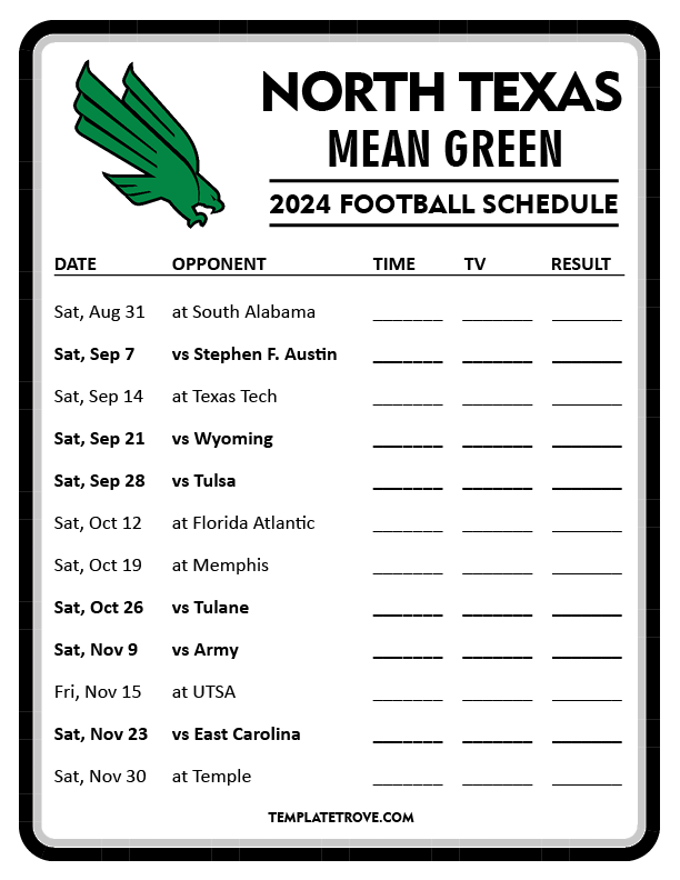 If you get a chance, please share the schedules through social media with your fellow Mean Green Fans. It's easy, and it would help us out a bunch, just click one of the social share buttons at the right of the screen on desktop or the black share button at the bottom right on mobile phones.