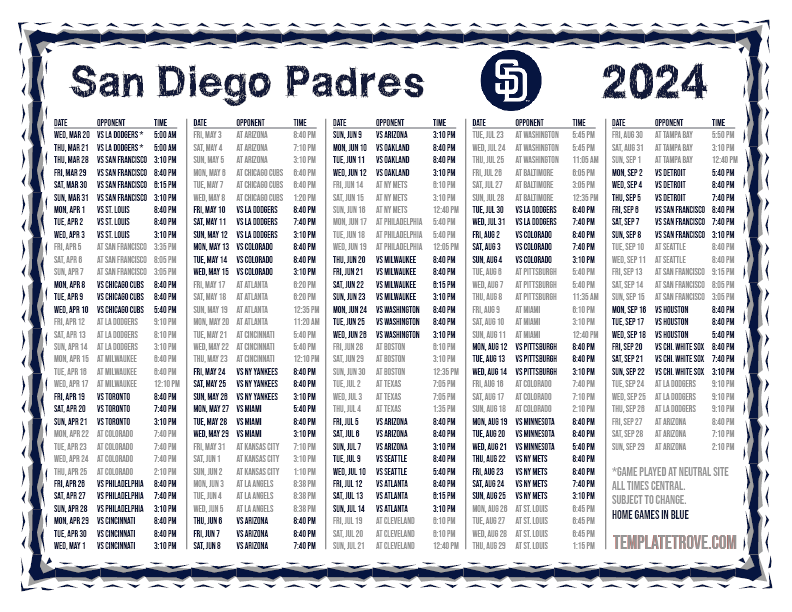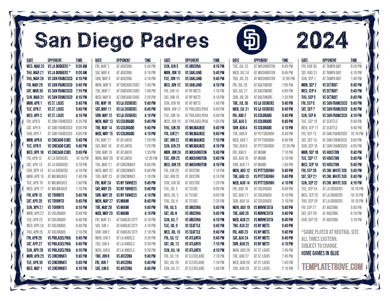 Keep up with the 2024 San Diego Padres with our handy printable schedules, now available for each US time zone.