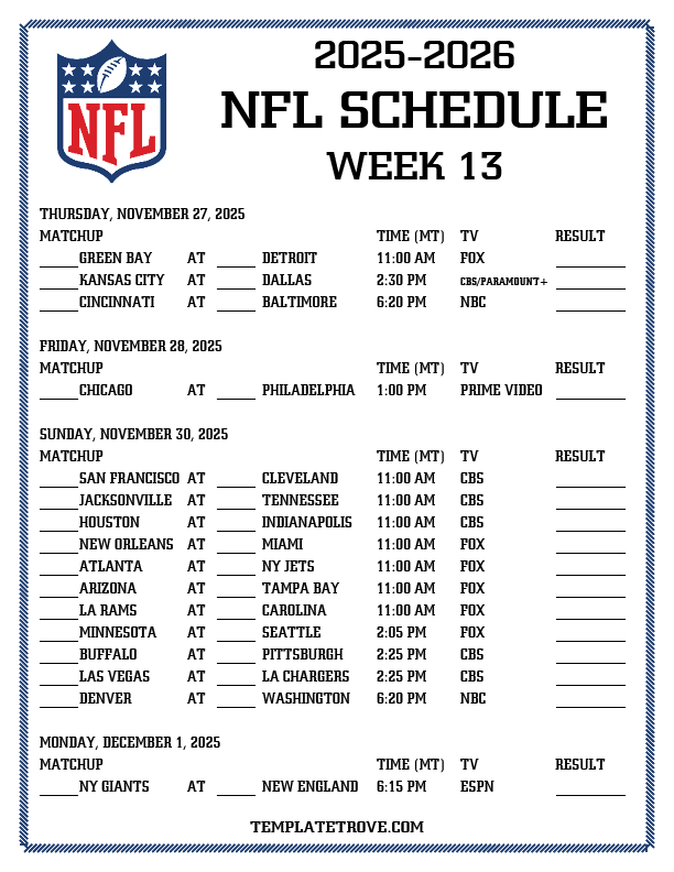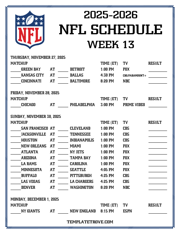 Printable 2025-26 NFL Schedule Week 13