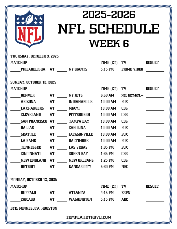 Printable 2025-26 NFL Schedule Week 6 - Central Times