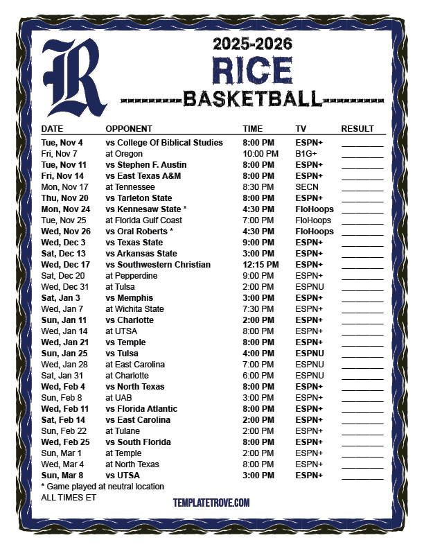 Keep up with the Rice Owls basketball in the 2025-26 season with our