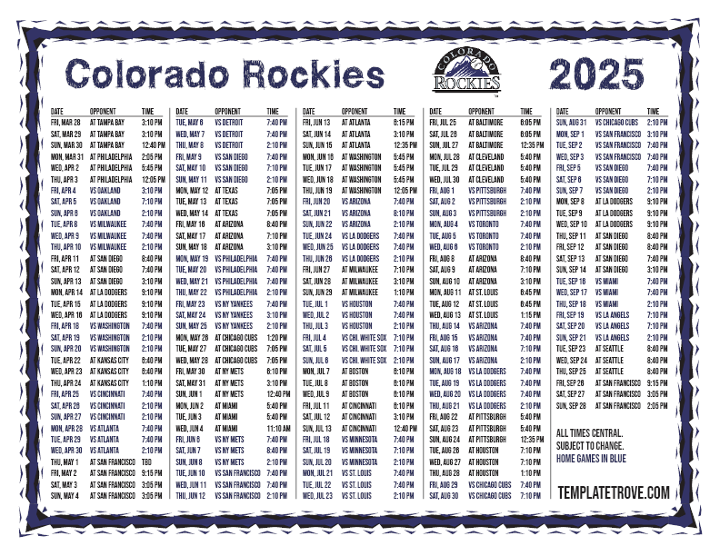 Keep up with the 2025 Colorado Rockies with our handy printable schedules, now available for each US time zone.