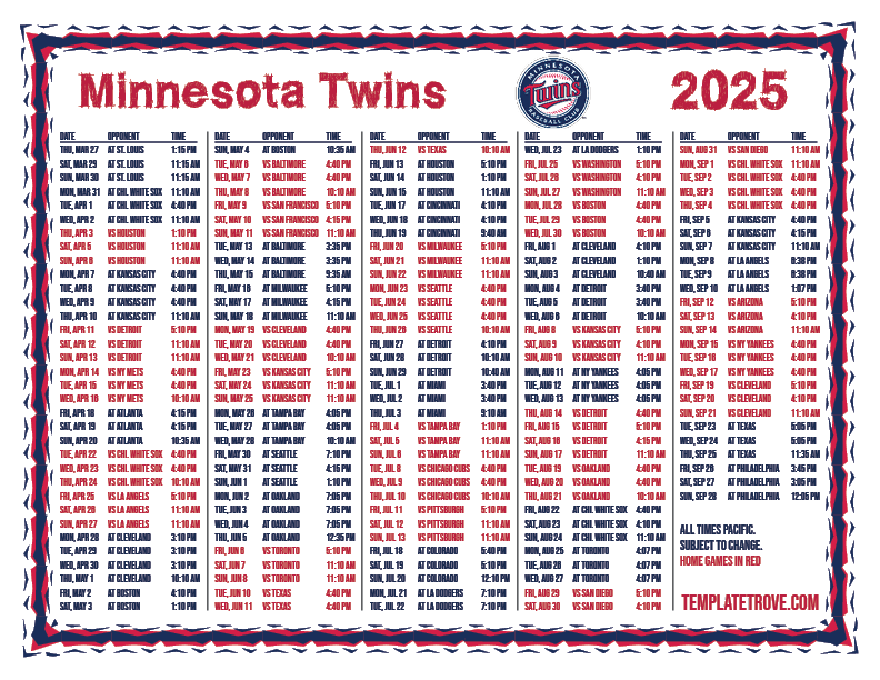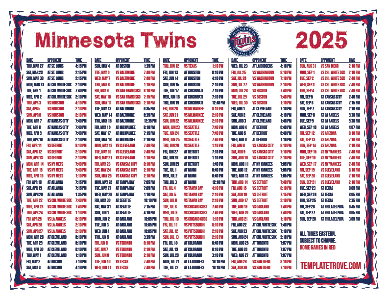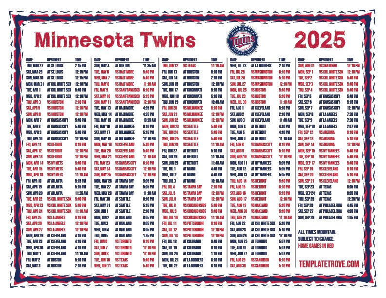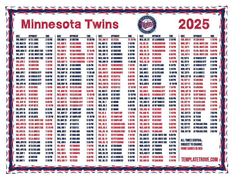Keep up with the 2025 Minnesota Twins with our handy printable schedules, now available for each US time zone.