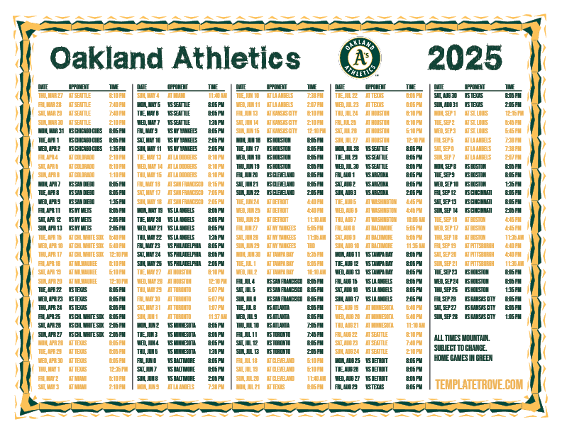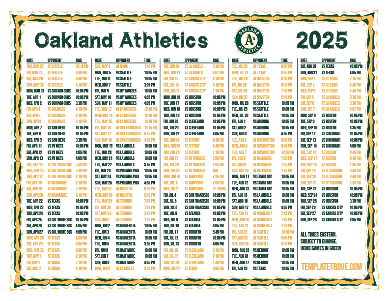 Keep up with the 2025 Oakland Athletics with our handy printable schedules, now available for each US time zone.