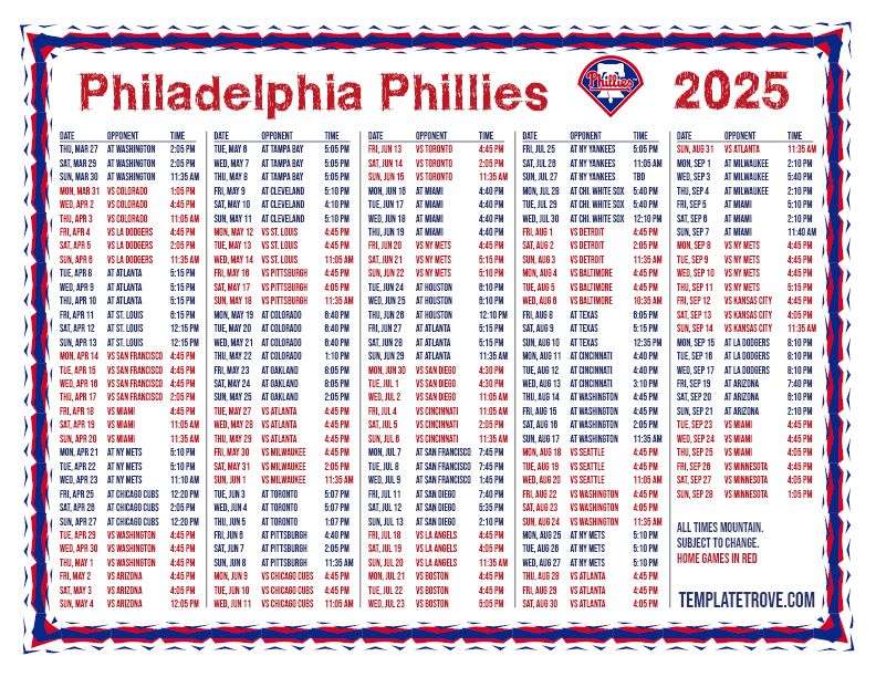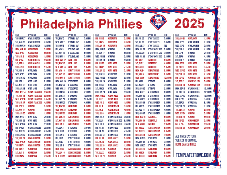Keep up with the 2025 Philadelphia Phillies with our handy printable schedules, now available for each US time zone.