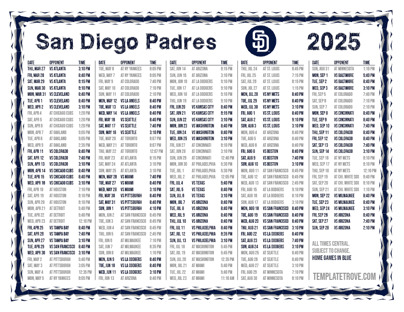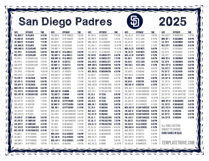 Keep up with the 2025 San Diego Padres with our handy printable schedules, now available for each US time zone.