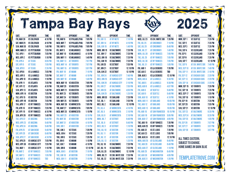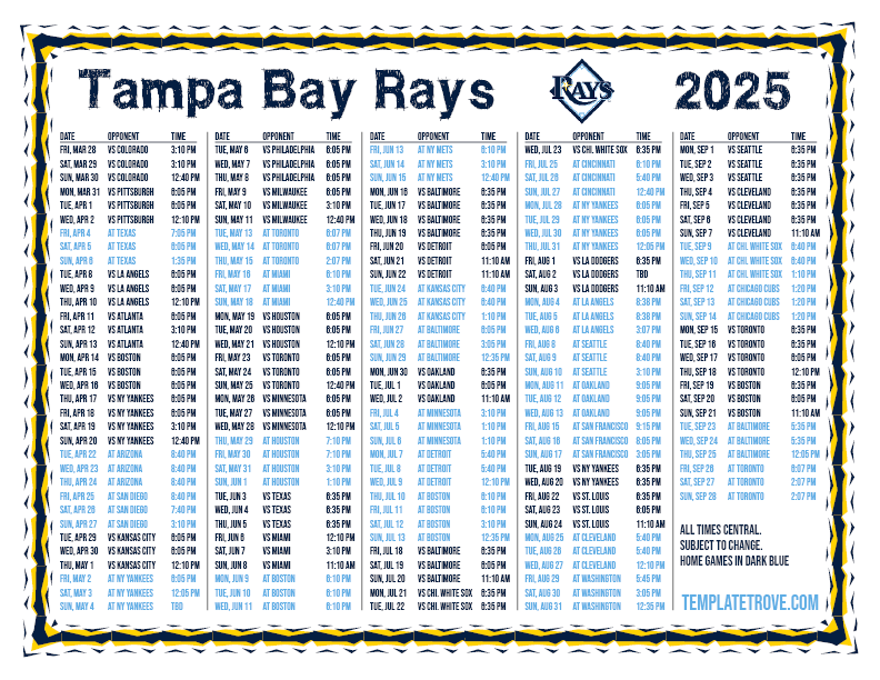 Keep up with the 2025 Tampa Bay Rays with our handy printable schedules, now available for each US time zone.
