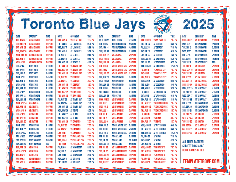 Keep up with the 2025 Toronto Blue Jays with our handy printable schedules, now available for each US time zone.