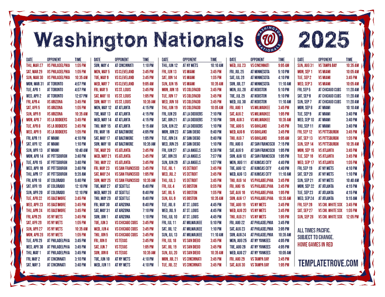 Keep up with the 2025 Washington Nationals with our handy printable schedules, now available for each US time zone.