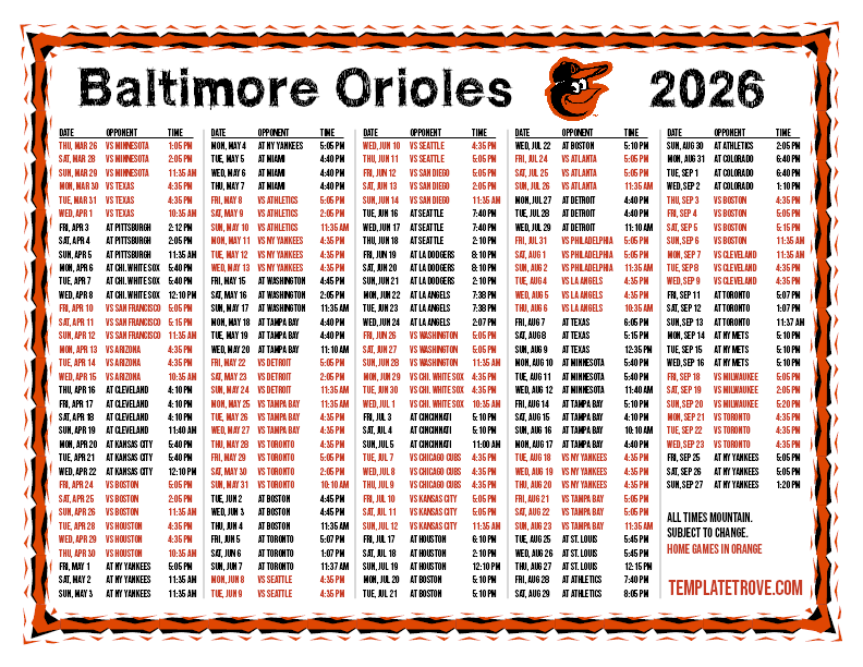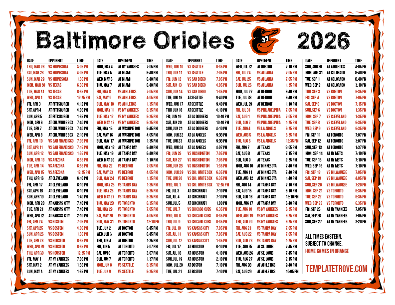 Keep up with the 2026 Baltimore Orioles with our handy printable schedules, now available for each US time zone.