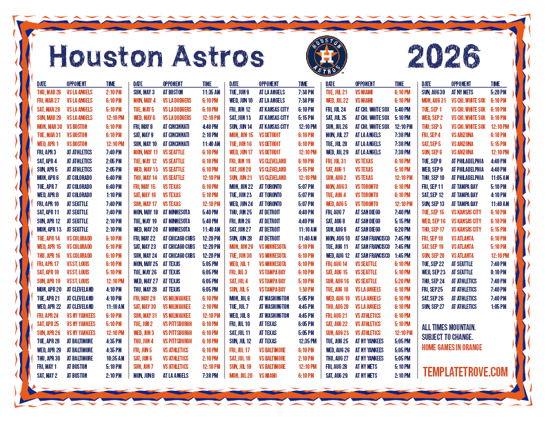 Keep up with the 2026 Houston Astros with our handy printable schedules, now available for each US time zone.