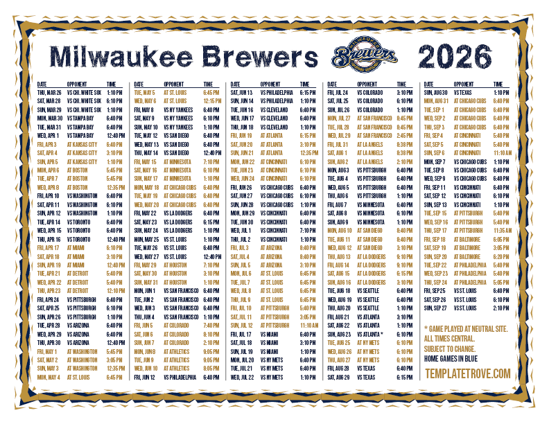 Keep up with the 2026 Milwaukee Brewers with our handy printable schedules, now available for each US time zone.