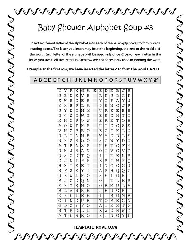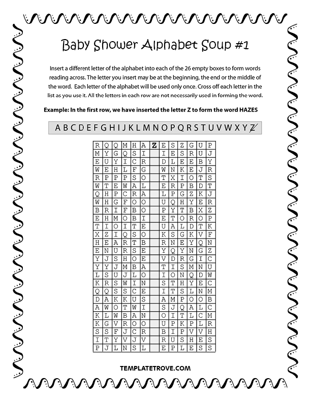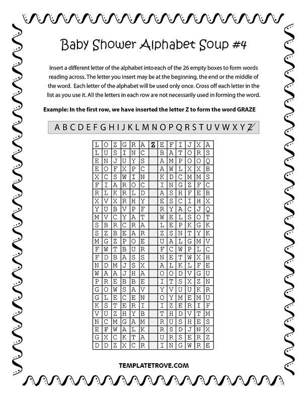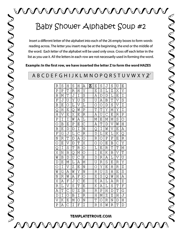 Insert a different letter of the alphabet into each of the 26 empty boxes to form words reading across. The letter you insert may be at the beginning, the end or the middle of the word. Each letter of the alphabet will be used only once. Cross off each letter in the list as you use it. All the letters in each row are not necessarily used in forming the word.