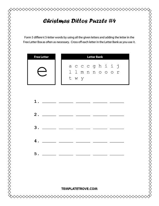 Form 5 different 5-letter words by using all the given letters and adding the letter in the Free Letter Box as often as necessary. Cross off each letter in the Letter Bank as you use it.