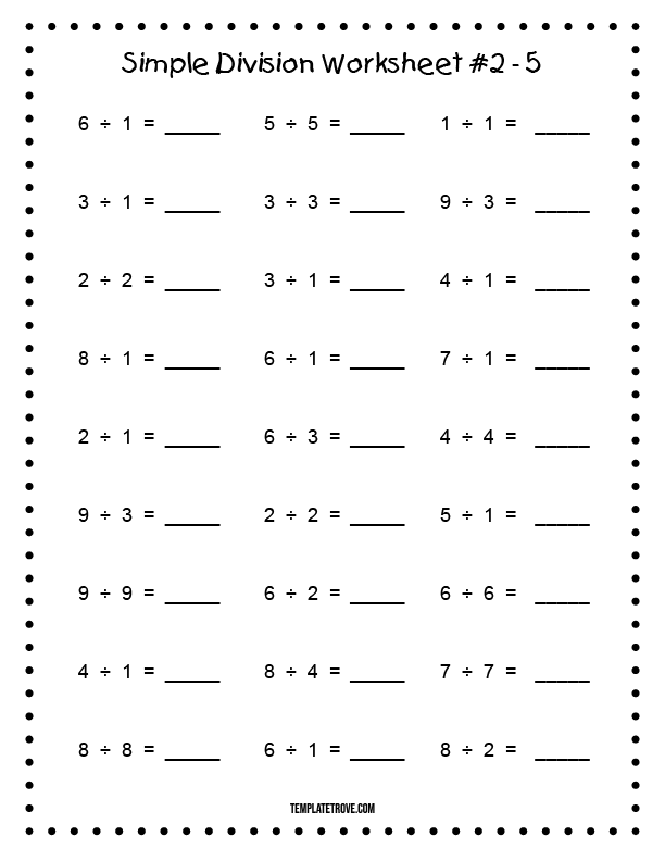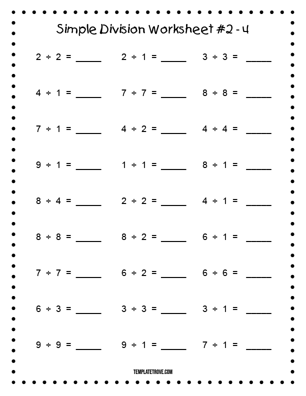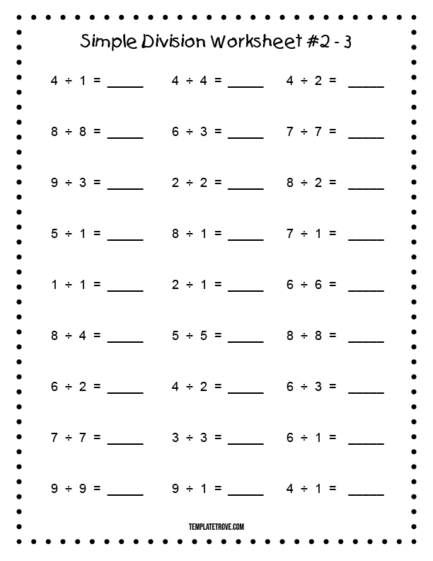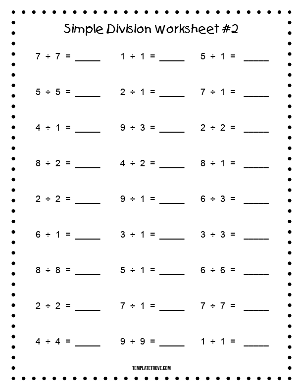 At Template Trove, we provide simple division worksheets for 3rd grade students. Our math worksheets are printable and include answer sheets for you or your student to check the correct answers.