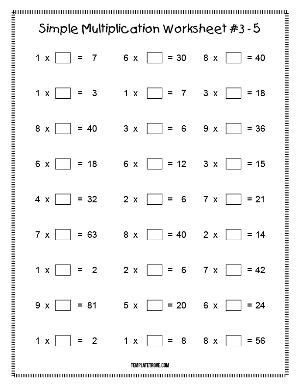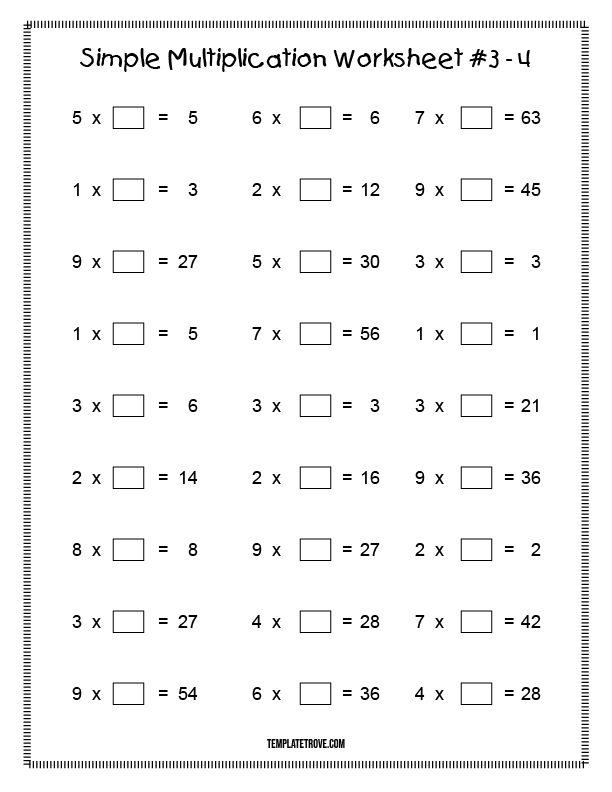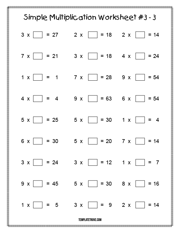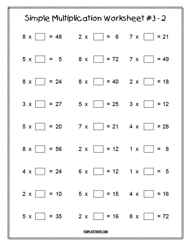 At Template Trove, we provide simple multiplication worksheets for 2nd and 3rd grade students. Our math worksheets are printable and include answer sheets for you or your student to check the correct answers.