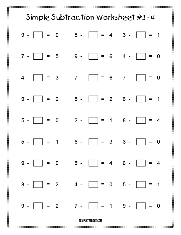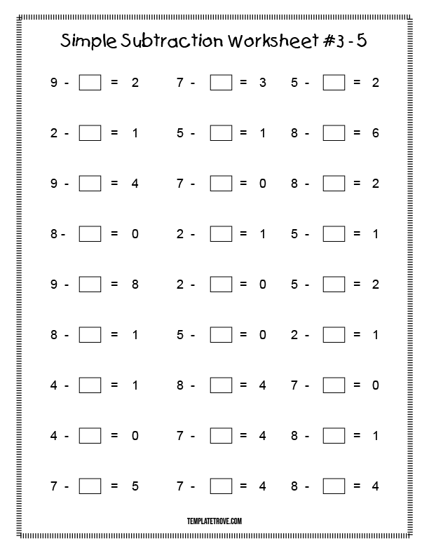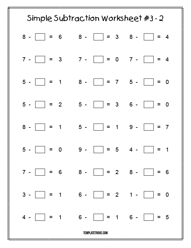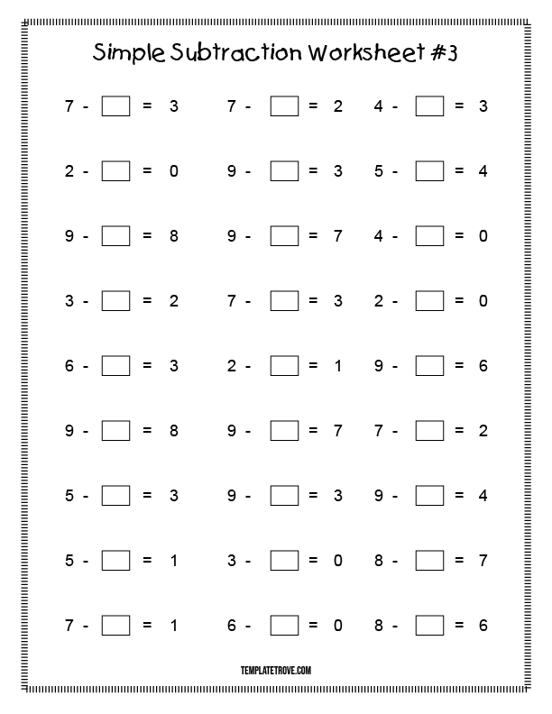 At Template Trove, we provide simple subtraction worksheets for students starting to learn subtraction. Our math worksheets are printable and include answer sheets for you or your student to check the correct answers.