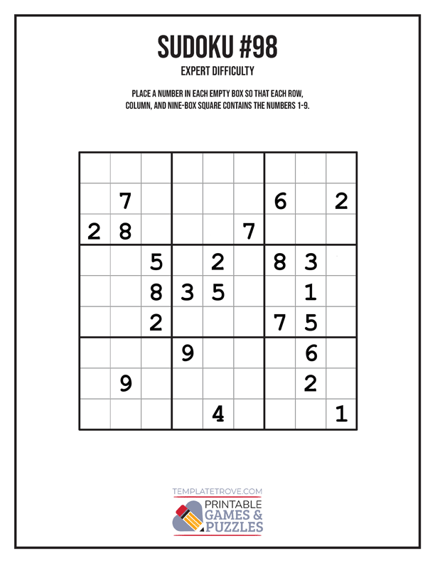 You can use any laser or inkjet printer for printing these expert Sudoku puzzles. Puzzles print on letter-size paper.