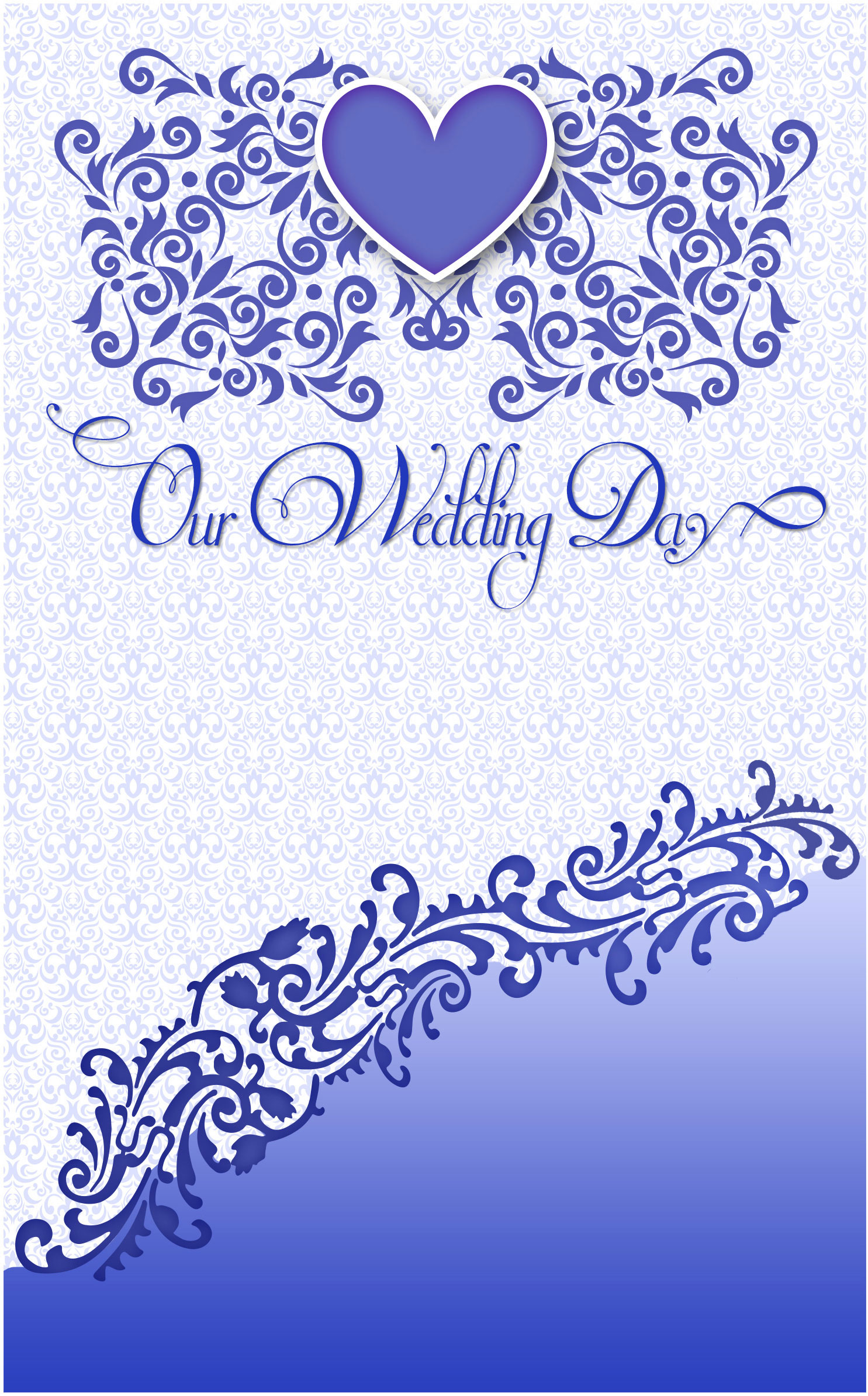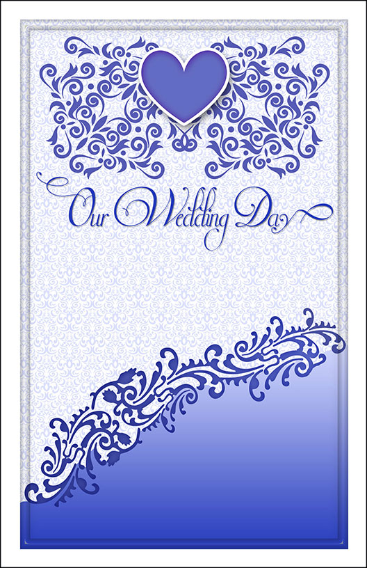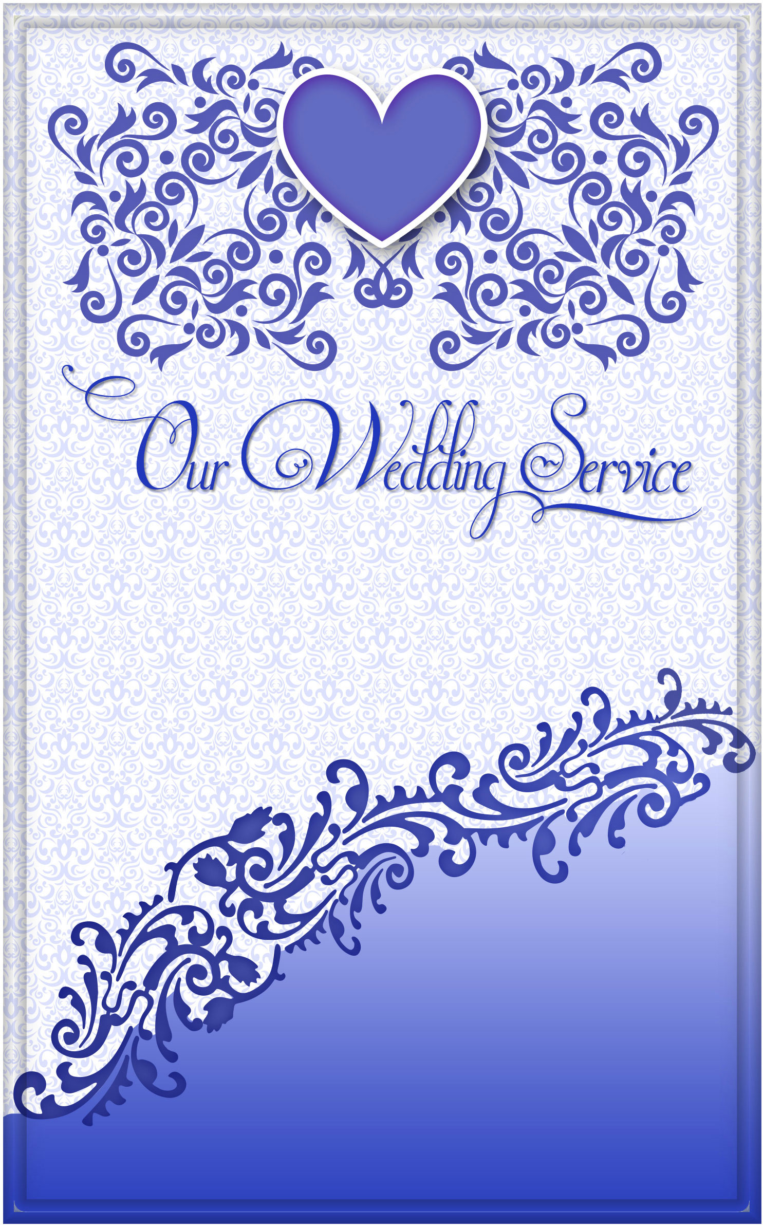 A small gradient blue heart floating over a blue floral motif at top center highlights this template. It also has a curved blue floral design at bottom with plenty of room for your wedding ceremony details.