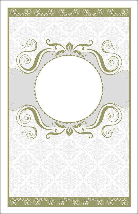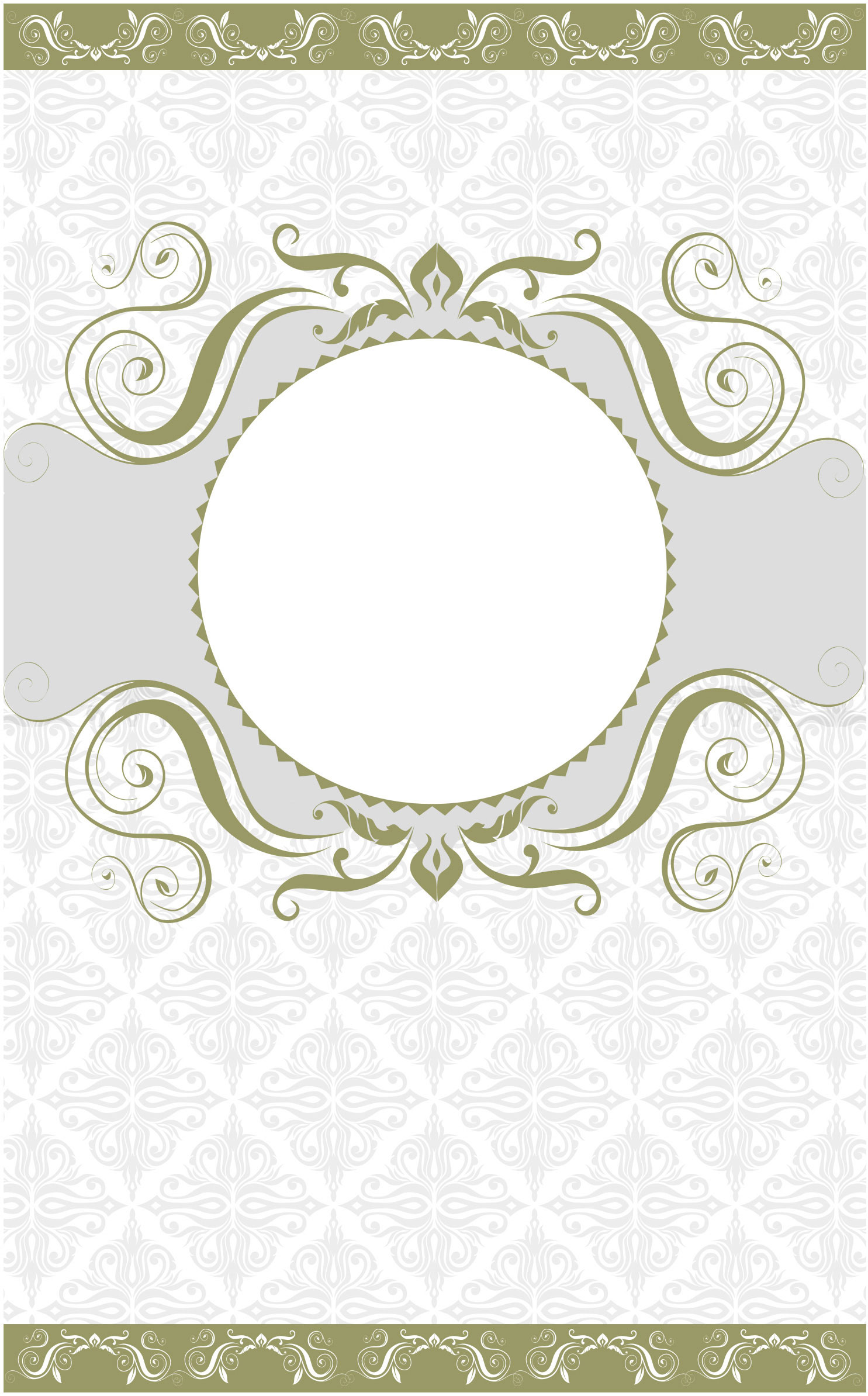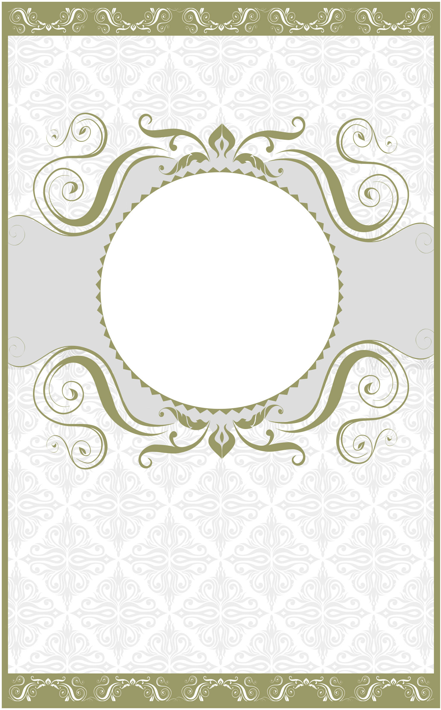 This template has a khaki swirl design on the top and bottom of a circular border. It also has a grayscale background and a reversed khaki swirl design at top and bottom of page.