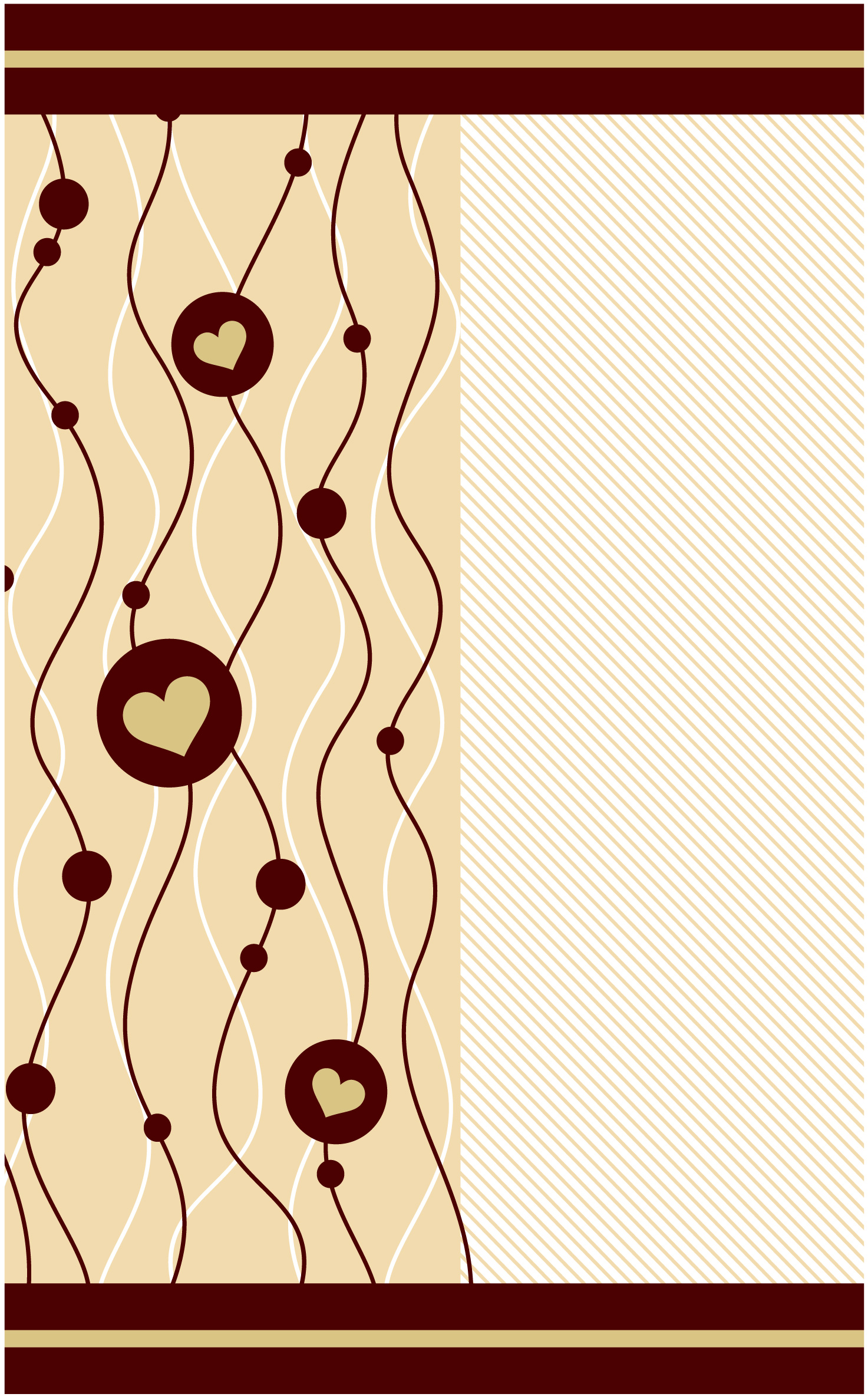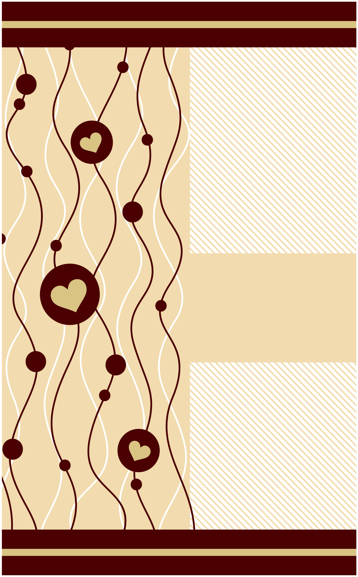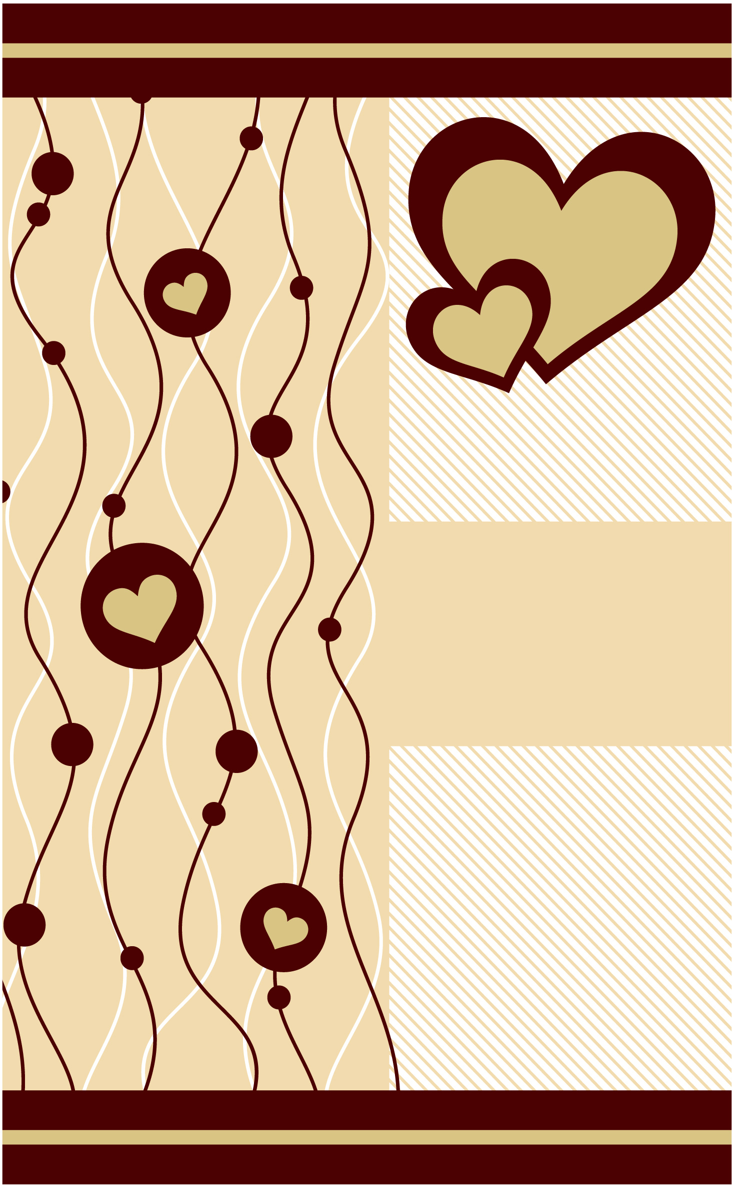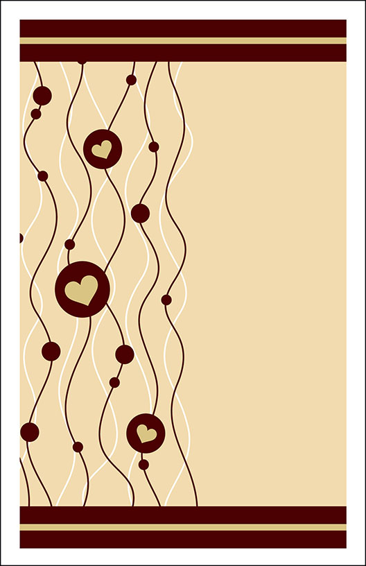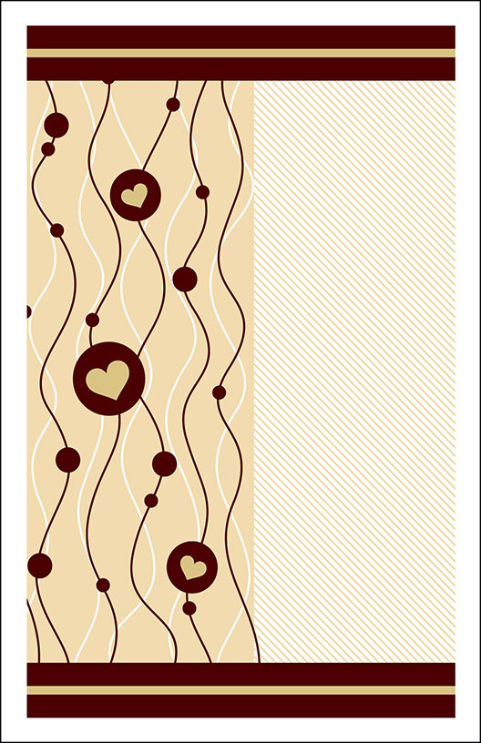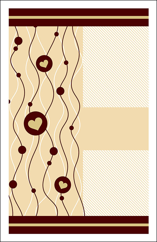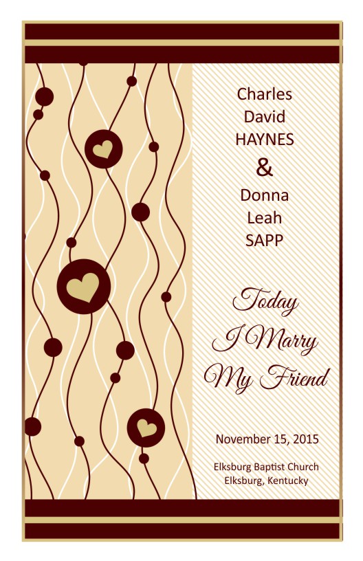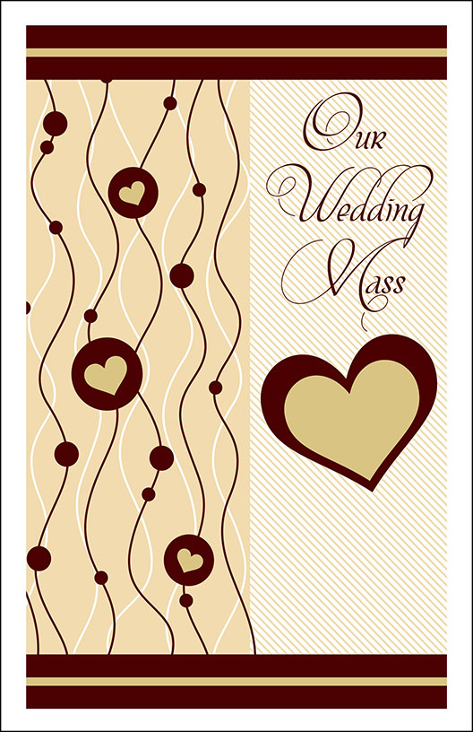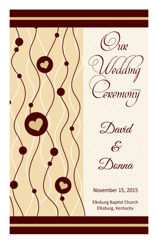 Template features stringed burgundy and tan hearts on top of a light tan background. Burgundy double bars at top and bottom of design. Ceremony information can be added to the right side of cover which has diagonal light tan lines and some graphics have a darker tan highlight box.