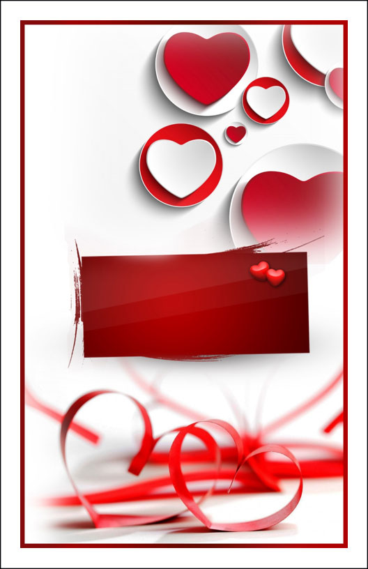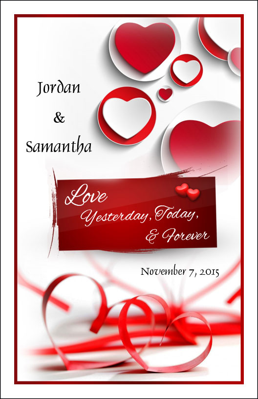 Template includes red and white heart buttons and red ribbons. Add names or your favorite verse to the red box in middle. Perfect for a Valentine's Day wedding ceremony.