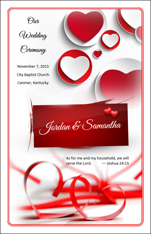 Use wedding program cover template to create your own wedding programs. Template 2 offers 3 different pre-designed layouts with wording or download any of the graphics and customize your own ceremony wording.