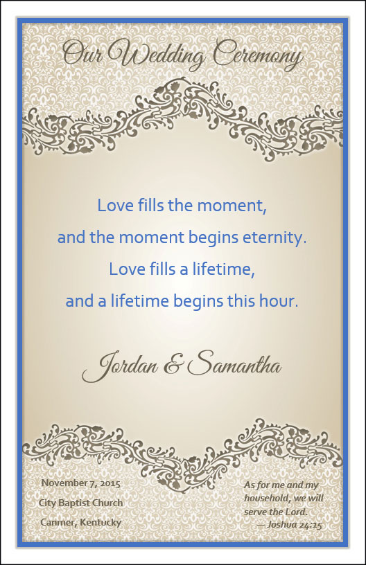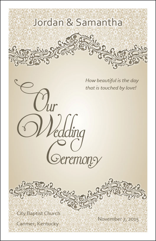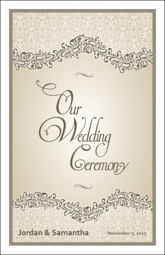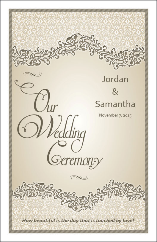 Use wedding program cover template to create your own wedding programs. Template 4A offers 4 different pre-designed layouts with wording or download any of the 8 graphics and customize your own ceremony wording.