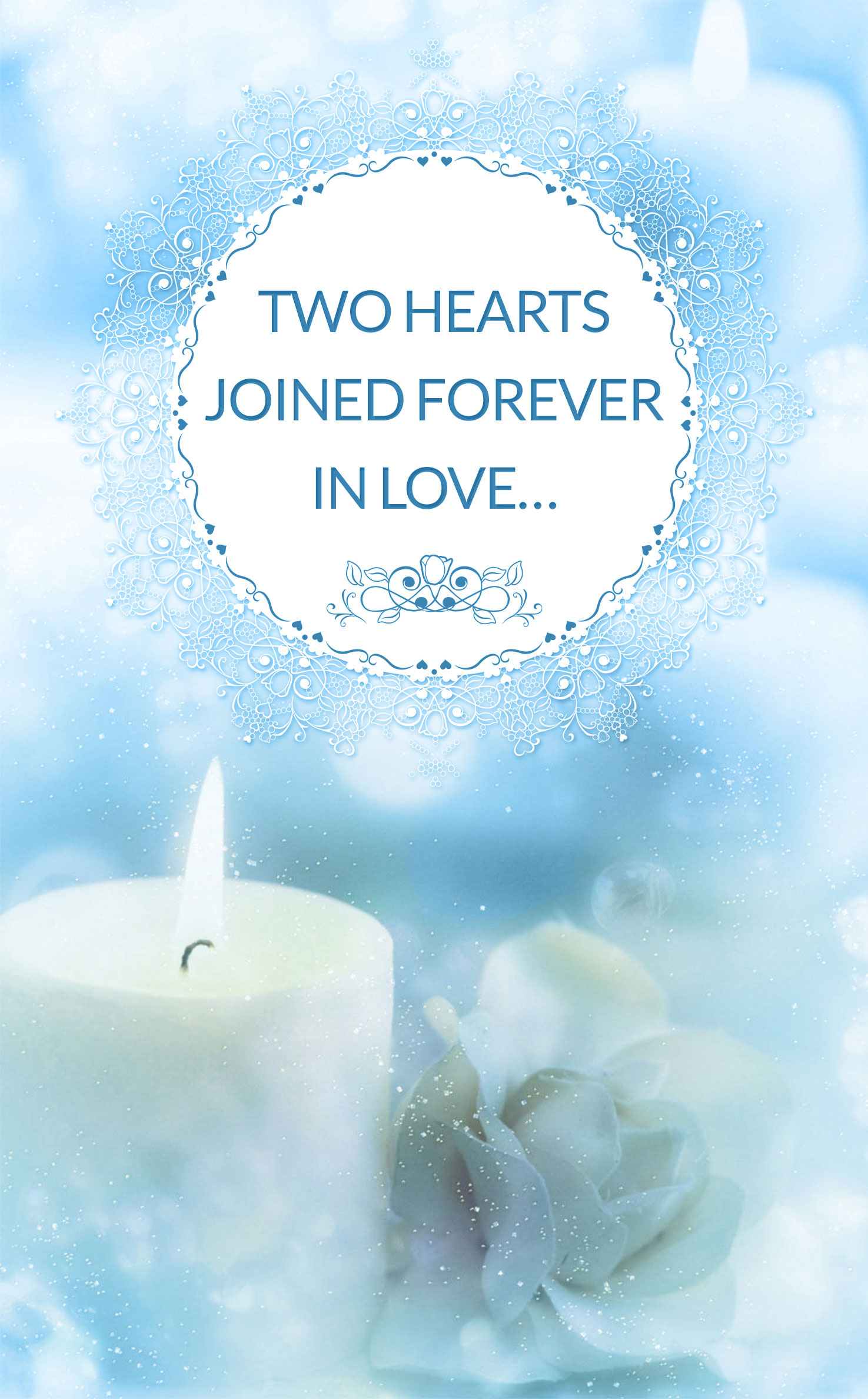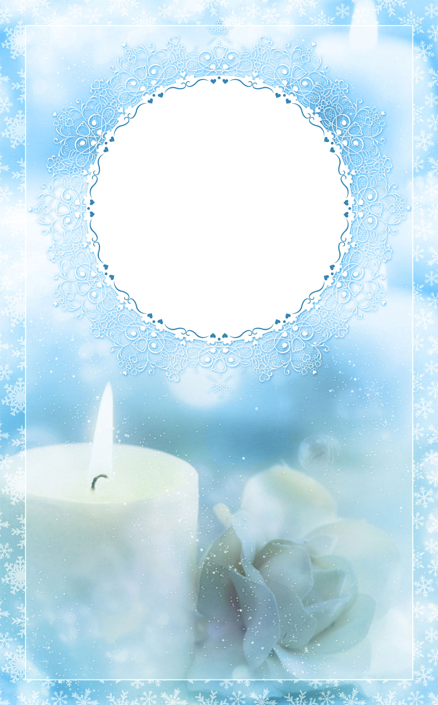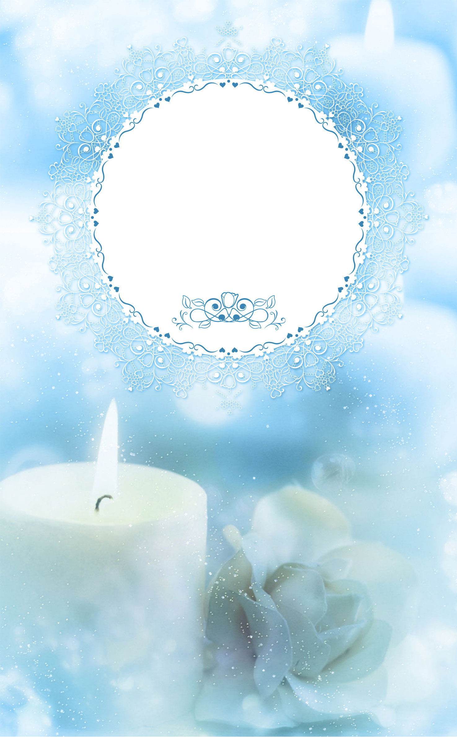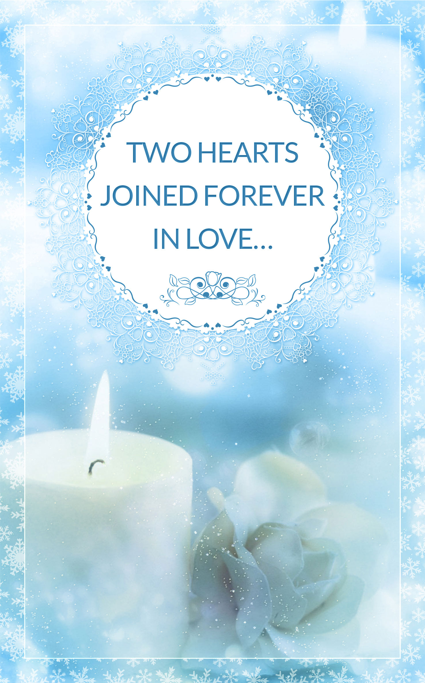 This template is designed for winter wedding ceremonies. Design incorporates white candles and flowers with a light blue background with snow flakes embedded. Design also includes a round lace border where you can add any text or graphic desired.