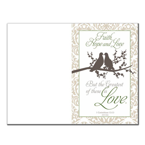 The bible verse: Faith, Hope and Love But the Greatest of these is Love. I Corinthians 13:13 (NIV1984), all in large fancy script type.