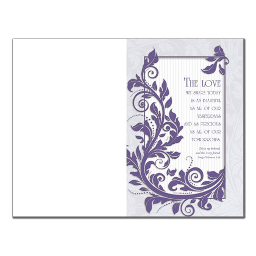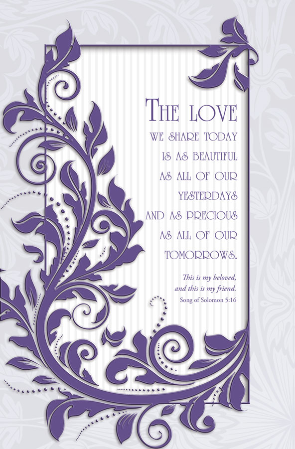Wedding program paper design 6337 has a floral, light gray background with purple floral motifs. Wording reads, The love we share today is as beautiful as all of our yesterdays and as precious as all of our tomorrows.