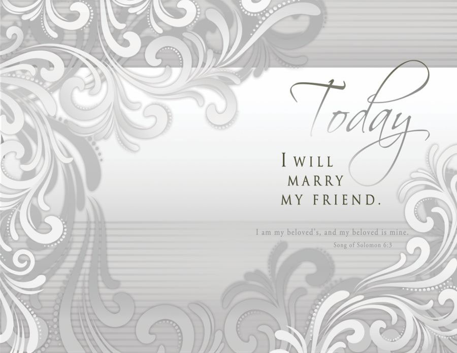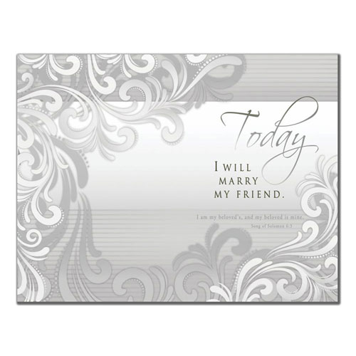 Wedding program paper design 6338 has a grayscale floral motif that covers the front and back of the program. The phrase, Today I will marry my friend is on front.