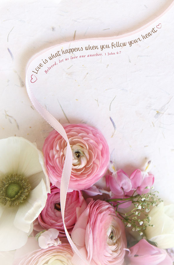 The bible verse: Beloved, let us love one another. 1 John 4:7 is also on the ribbon.