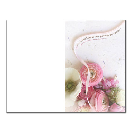 Wedding program paper design 6357 features pink and white flowers and a ribbon that contains the wording: Love is what happens when you follow your heart.