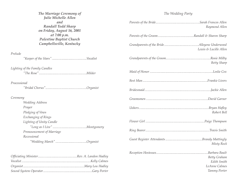 Wedding program templates are designed for printing on our pre-printed letter size wedding program paper. You can view our selection of program paper by clicking the wedding program paper tab at right. They can also be printed on blank, 8 1/2" x 11" paper. Use one of our back templates to complete the program. Folded size of program is 5 1/2" x 8 1/2".