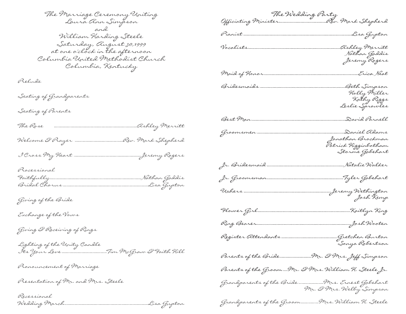 Wedding program templates are designed for printing on our pre-printed letter size wedding program paper. You can view our selection of program paper by clicking the wedding program paper tab at right. They can also be printed on blank, 8 1/2" x 11" paper. Use one of our back templates to complete the program. Folded size of program is 5 1/2" x 8 1/2".
